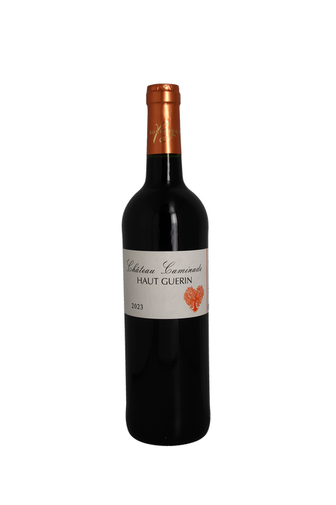 Implanté à Génissac, face aux appellations Pomerol et Saint-Émilion, le Château Caminade Haut Guérin est une exploitation familiale dont les origines remontent aux années 1930. Longtemps partagé entre deux familles, le domaine s’est structuré au fil des générations pour être aujourd’hui conduit par Pierre Caminade et Léa Terral. Le vignoble s’étend sur 30 hectares, dont 13,5 hectares en production, répartis sur deux plateaux aux sols graveleux mêlés de sables et d’argiles. L’encépagement repose sur le merlot, les cabernets sauvignon et franc, le malbec, ainsi que le sauvignon blanc, le sémillon et la muscadelle pour les blancs. Les élevages sont adaptés à chaque vin, entre cuves, lies et barriques d’acacia. Soucieux d’exprimer au plus près le terroir de Génissac, le domaine s’engage depuis 2024 dans une conversion en agriculture biologique, avec l’ambition de produire des vins veloutés, frais et fruités.